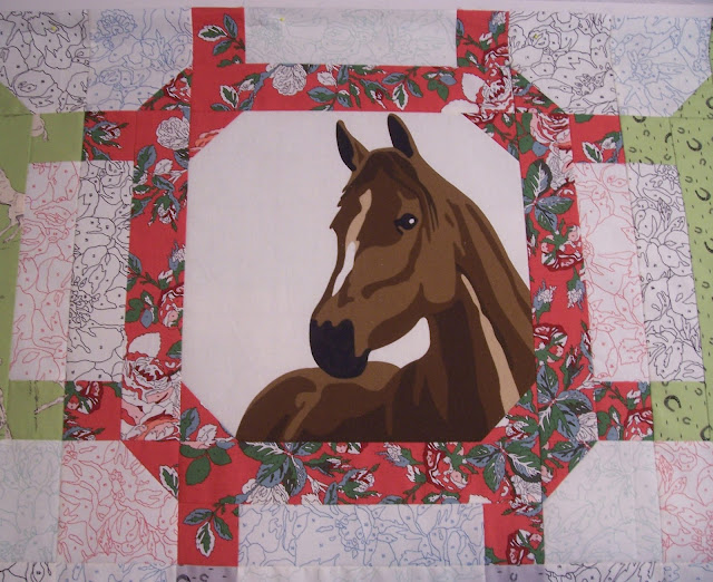 Of course, Little Wilbur was the star of the quilt, so he was top center. Instead of a corral, he was surrounded by a wreath of roses, as though he had just won the Kentucky Derby (a fanciful notion for which I have absolutely no basis).